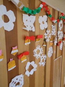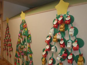 園児が作ったかわいいクリスマス飾りで、城東こども園はクリスマスムードたっぷりです。
